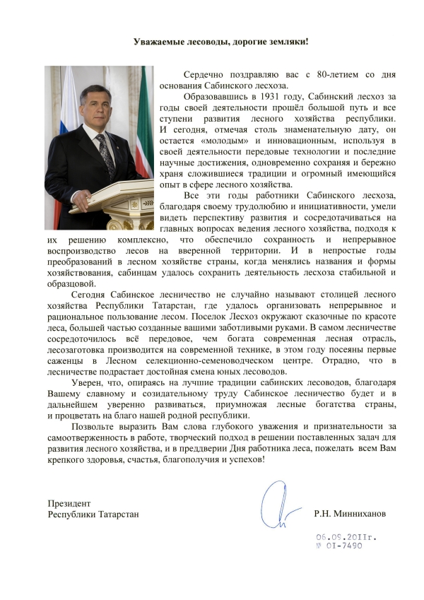 Президент РТ Р.Н. Минниханов поздравил лесоводов Сабинского лесничества