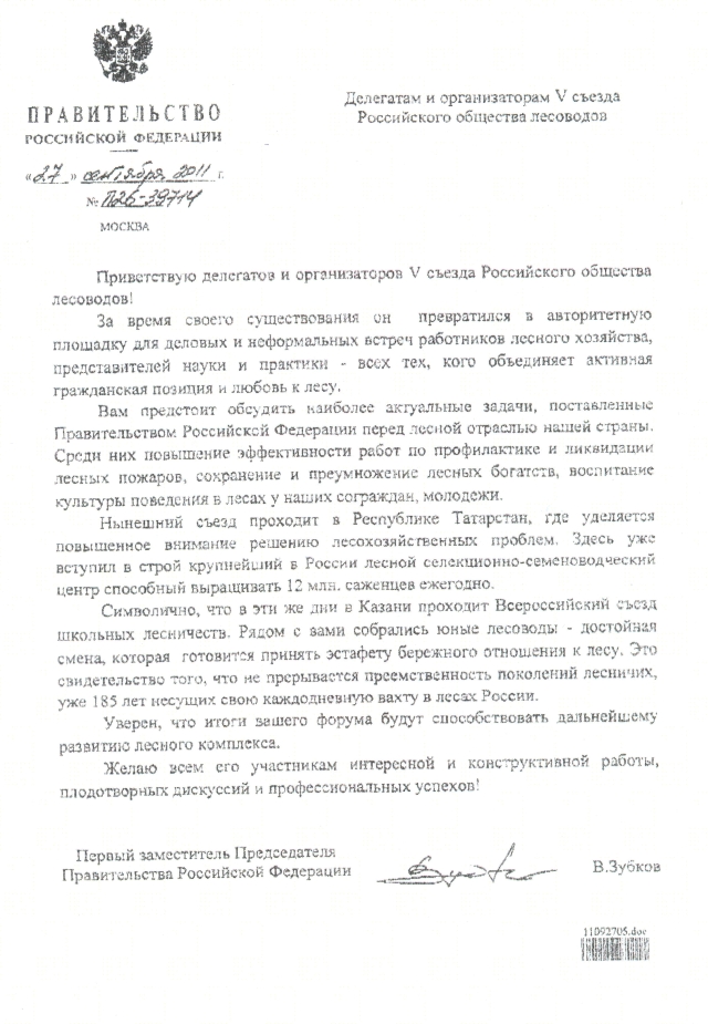 Старшее поколение лесоводов России собралось для обсуждения существующих в лесном хозяйстве проблем и выработки путей их решения. К лесоводам России с приветствием обратился первый заместитель Председателя Правительства РФ В. Зубков. Его зачитал статс-секретарь – заместитель руководителя Федерального агентства лесного хозяйства А. Панфилов.