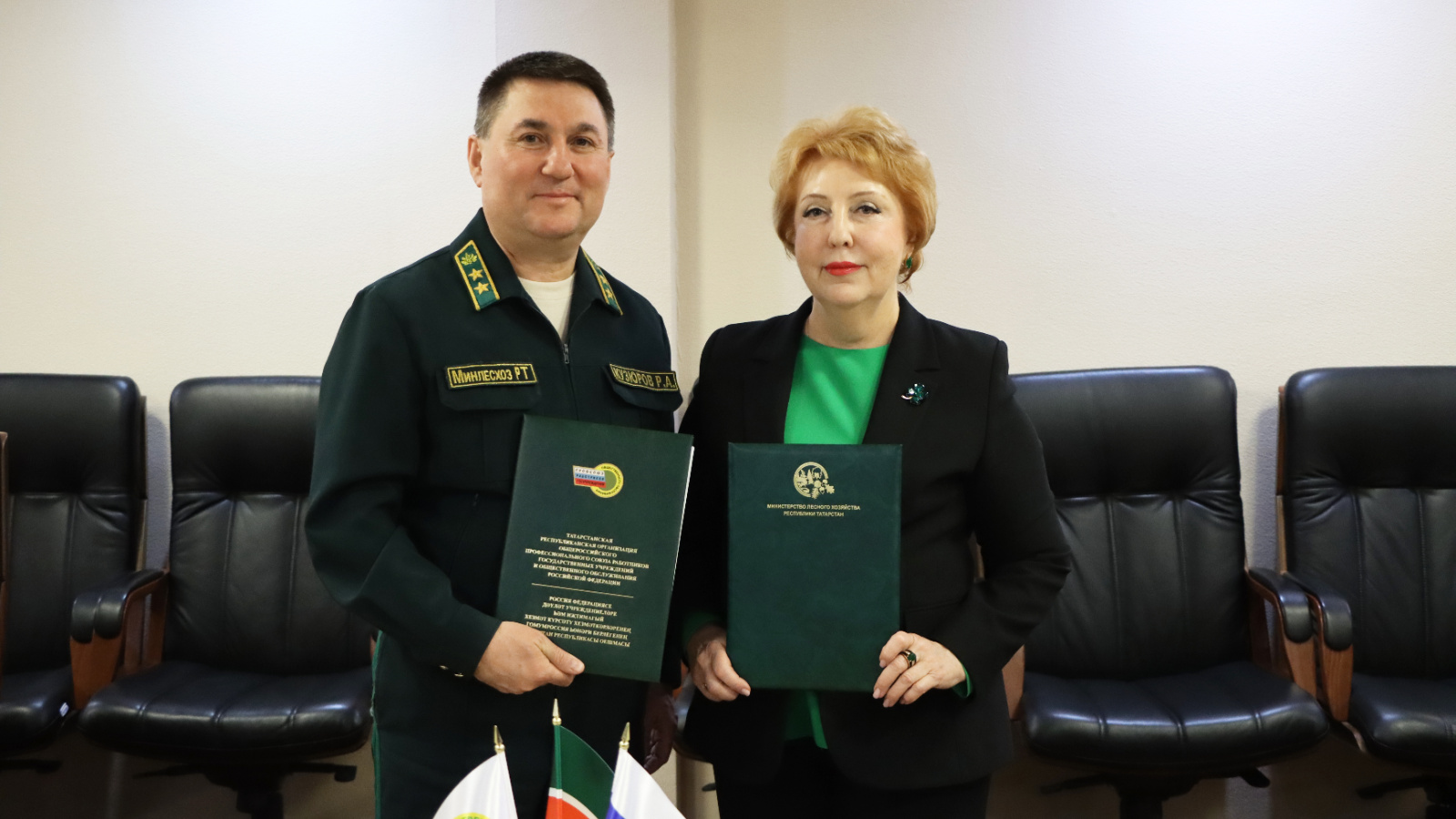 Сегодня министр лесного хозяйства РТ Равиль Кузюров встретился с председателем Татарстанской республиканской организации Общероссийского профсоюза работников государственных учреждений и общественного обслуживания РФ Ольгой Калашниковой.