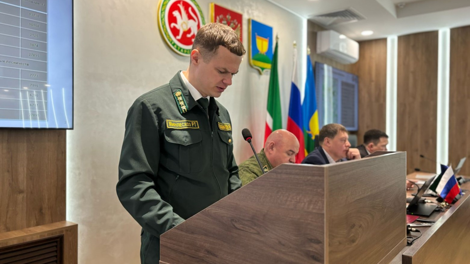 Җитәкче-урманчы Илнур Кәшафиев һәм урман хуҗалыгы директоры Виталий Шмелев нотыклар белән чыгыш ясады. Алар узган ел урманнарны саклау, яклау һәм яңадан торгызу буенча башкарылган эшләр һәм алдагы чорга өстенлекле бурычлар турында мәгълүмат бирделәр.